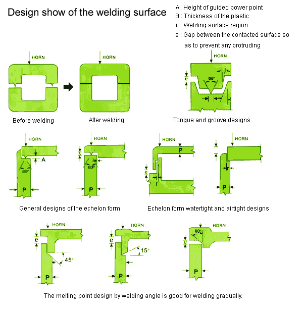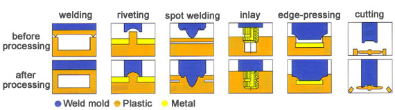 By the high-frequency vibration imposed on the welding thermoplastic parts so as to increase the friction between the plastic work-piece surface and the internal elements. The temperature on the contact will be raised rapidly. When the temperature is raised up high enough to melt the plastic, the contacted surfaces between the welded parts will increase a melting layer. When the vibration stops, the welded parts will be solidified and complete the welding.